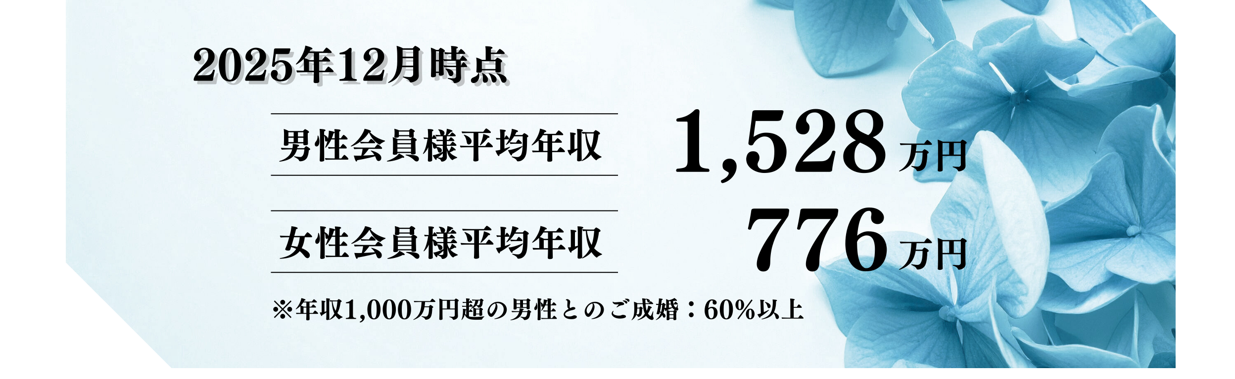 弊社男性会員様の80%以上は年収1,000万円以上、女性会員様の50%以上は年収700万円以上でございます。